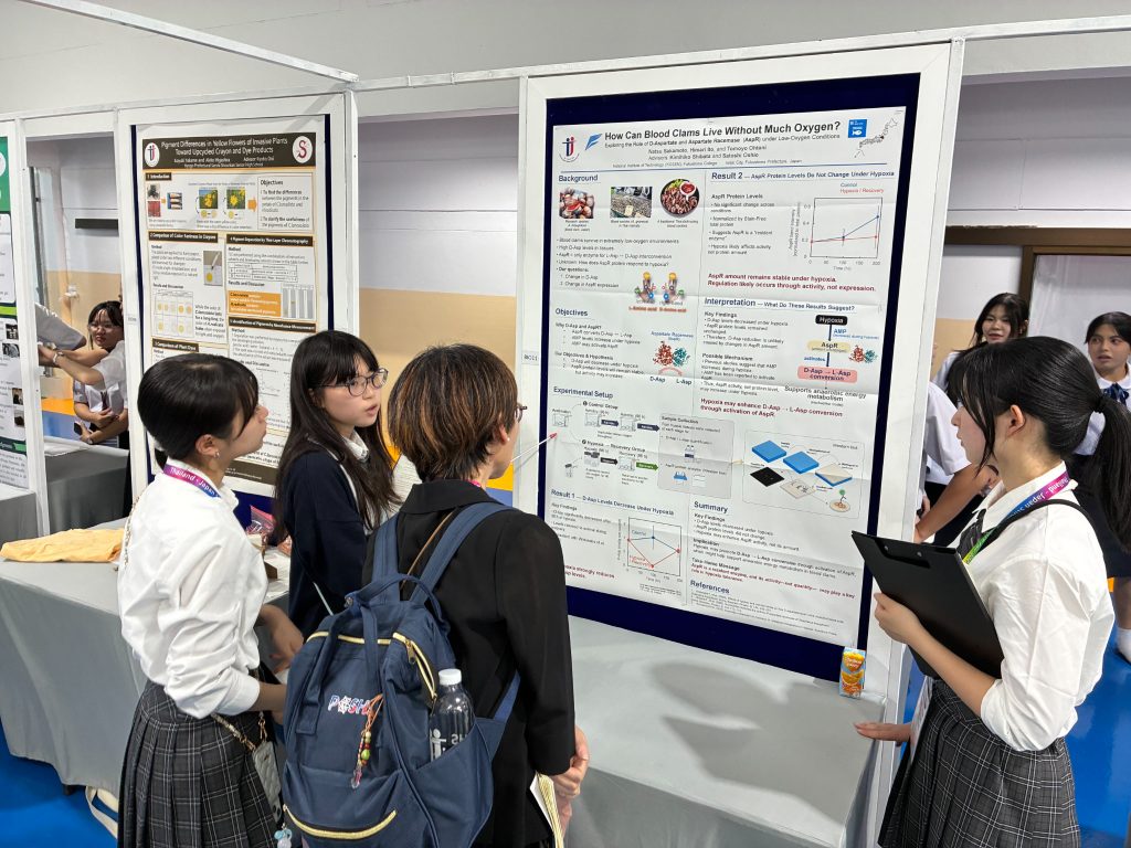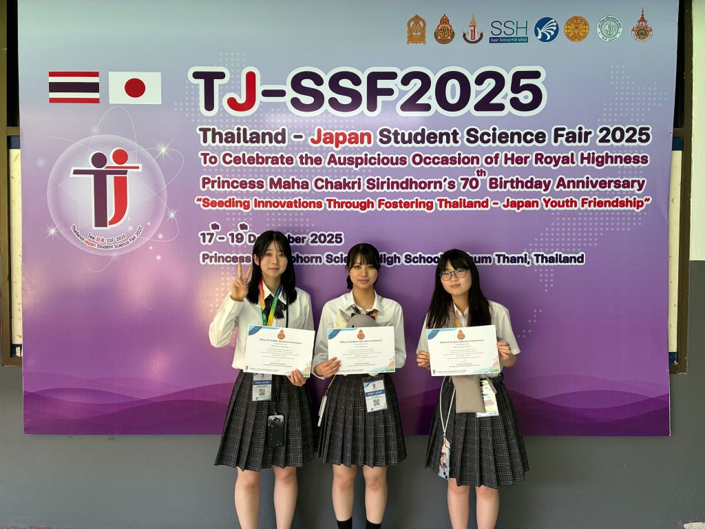 私たちは、12月16日から20日に、タイ王国で開催された日タイ高校生サイエンスフェアに参加しました。「アカガイはなぜ低酸素でも生きられるのか」という研究内容について、口頭発表およびポスター発表を行いました。発表を通して、自分たちの研究について多くの人に説明するとともに、質問や意見をいただいたことで、研究をさらに深め、より良いものにしていくきっかけとなりました。また、他分野の研究にも触れ、新たな視点を得る貴重な機会となりました。