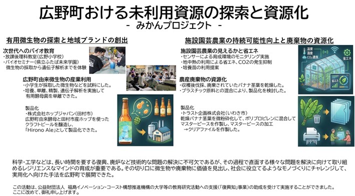 科学、工学、技術は、長い時間を要する復興、廃炉など様々な問題に直面しながらも解決に向けて取り組むために必要なレジリエンスなマインドの育成に必要で、その切り口に微生物や廃棄物に価値を見出し、社会に役立てるようなモノづくりにチャレンジし、手法とその展開を実践できた。 この活動は、公益財団法人 福島イノベーション・コースト構想推進機構の大学等の教育研究活動への支援(「復興知」事業)の助成を受けて実施することができました。