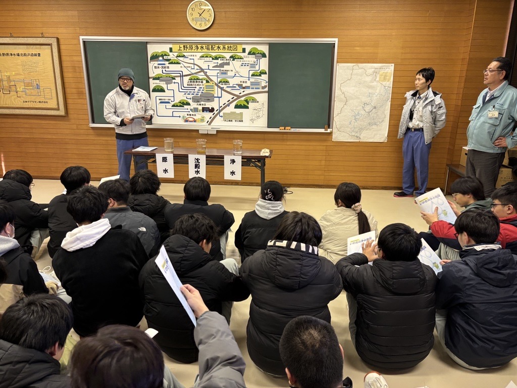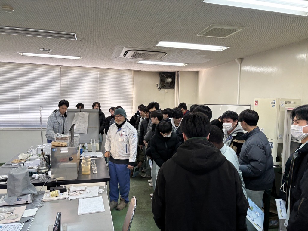 1月22日(木),都市システム工学科4年生が,水処理演習(工学実験演習)の一環で上野原浄水場を見学しました。水道システムの説明を受けた後,薬品の注入率を決めるための「凝集実験」や,24時間体制で稼働している「中央管理室」,浄水場の主役である「処理施設」や「ポンプ室」を順番に見学しました。特に,ろ過池を洗浄する逆流洗浄の工程では,目の前で膨大な水が動く迫力に学生たちから歓声が沸き起こりました。
